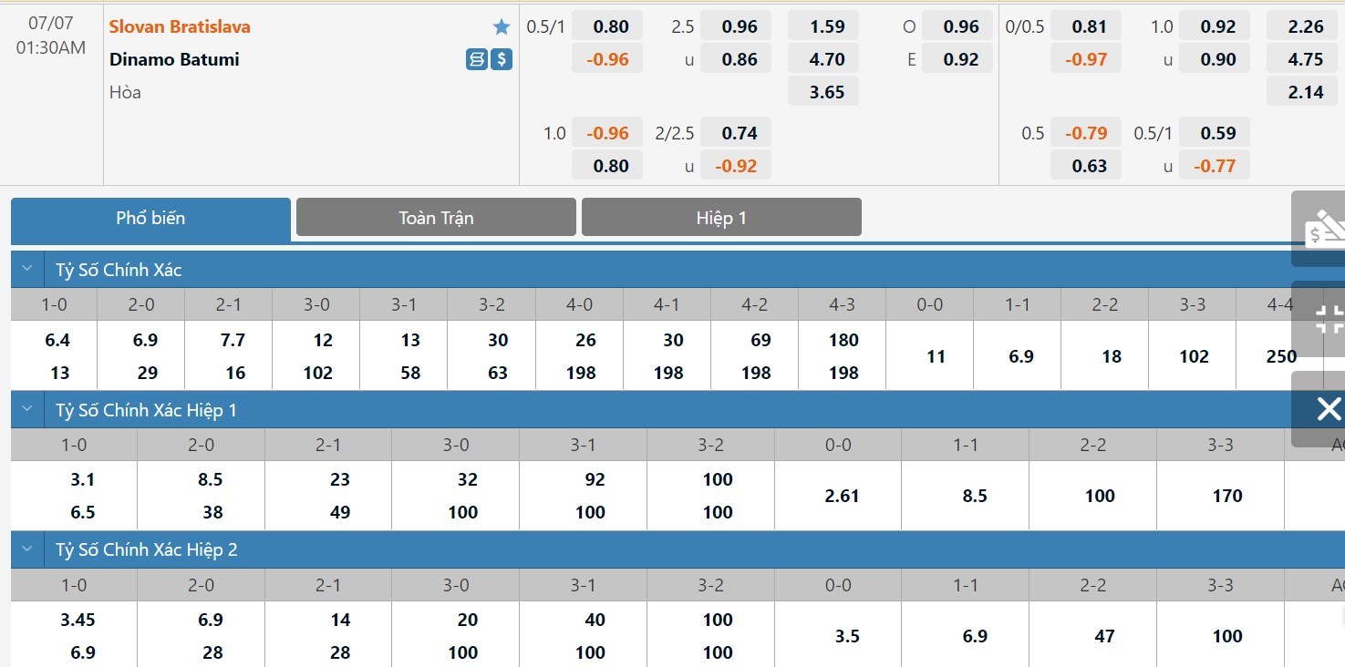 Tip kèo tỷ số hiệp 1: Slovan Bratislava 1-0 Dinamo Batumi