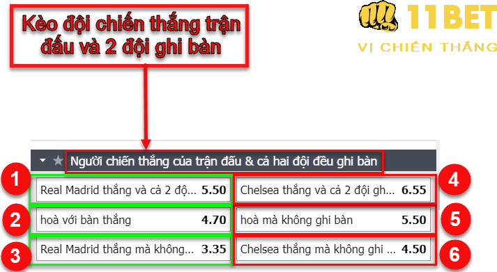 Với loại kèo đội chiến thắng trận đấu và 2 đội ghi bàn thì sẽ có những lựa chọn sau cho người cược dự đoán: