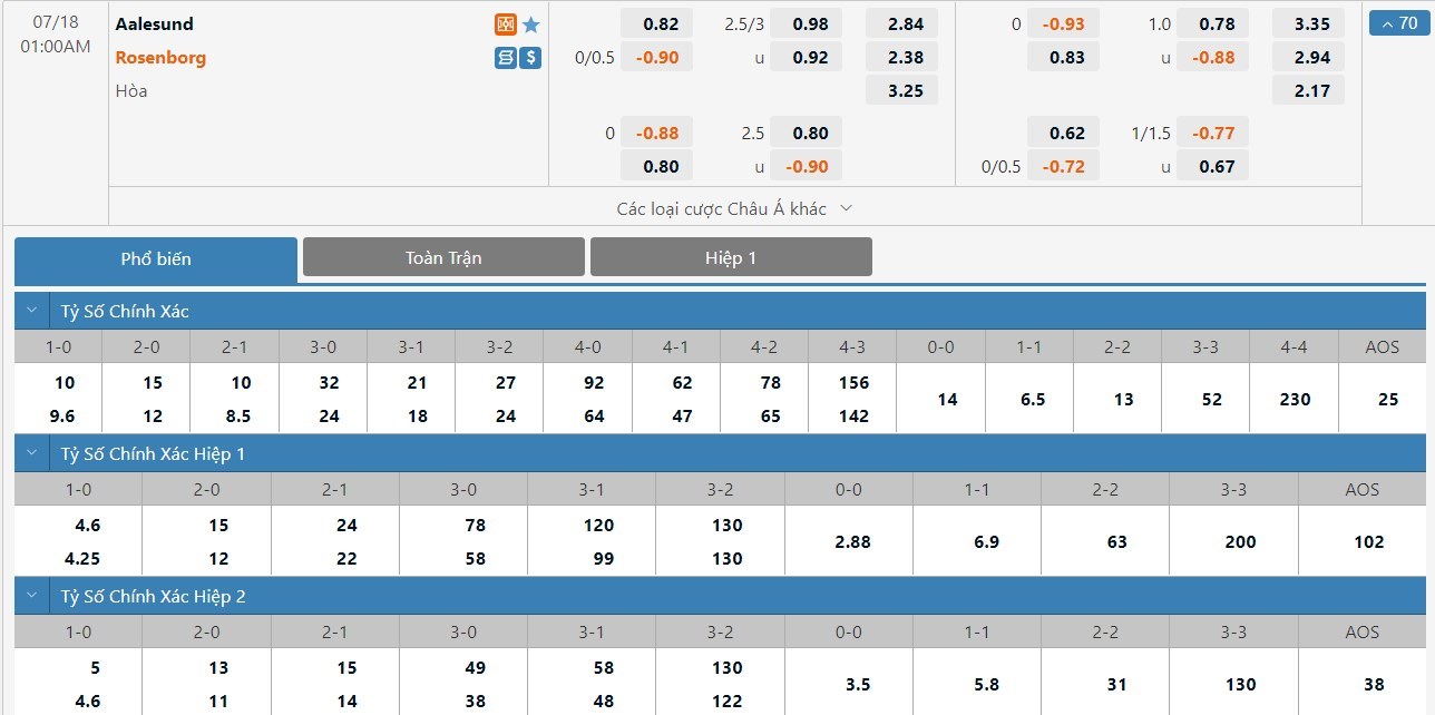 Phải làm khách tuy nhiên Rosenborg vẫn sẽ được đánh giá cao hơn đôi chút so với Aalesund ở trận này. Kết quả Rosenborg thắng trận có tỷ lệ cược là 1 ăn 2.38 trong khi đó kết quả Aalesund thắng trận có tỷ lệ cược là 1 ăn 2.84. Tỷ số hòa có tỷ lệ cược là 1 ăn 3.25. Rosenborg lúc này đang có phong độ rất cao. Đón tiếp một đối thủ trên cơ đang thi đấu rất hiệu quả, Aalesund sẽ rất khó tạo ra được bất ngờ và họ sẽ phải nhận một thất bại ở trận đấu này.