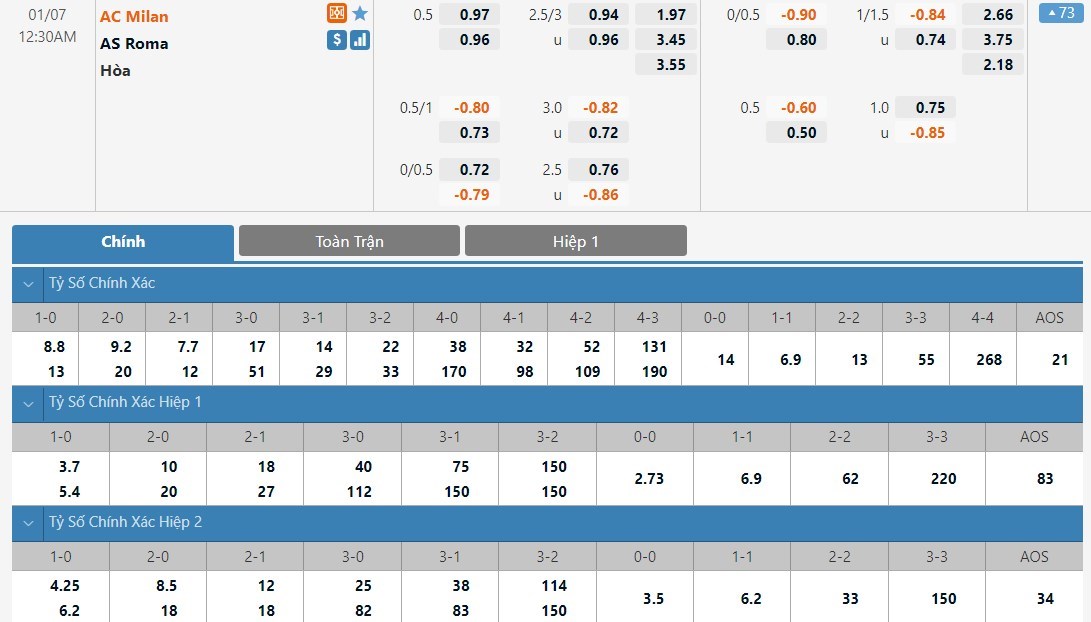 Soi kèo tài xỉu, kèo tỷ số AC Milan vs AS Roma