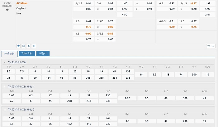 Soi kèo tài xỉu, kèo tỷ số AC Milan vs Cagliari