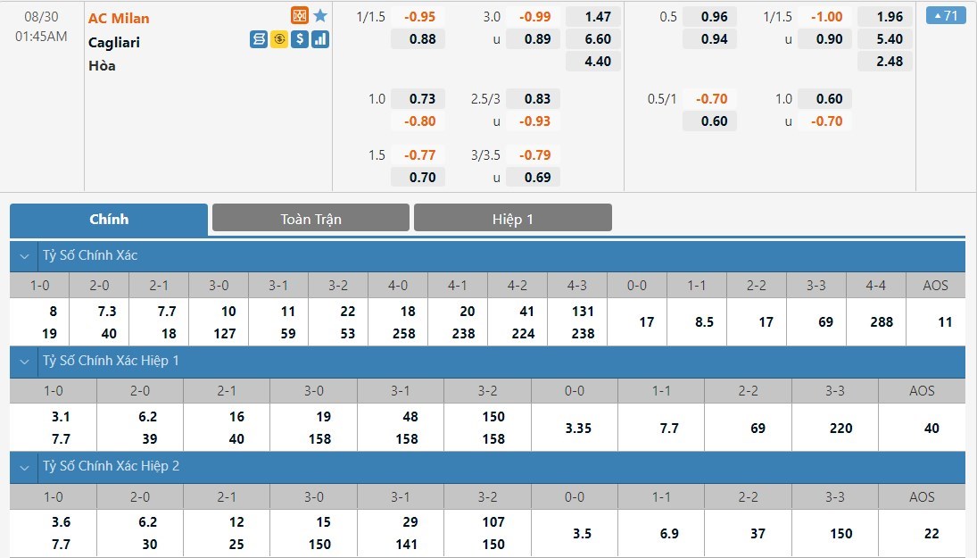 Cagliari đang phòng ngự không tốt khi mà ở vòng đấu đầu tiên, họ để một Spezia không quá mạnh chọc thủng lưới tới 2 lần. AC Milan lúc này lại vẫn đang tỏ ra khá hiệu quả và trước một đối thủ dễ chịu, họ có thể sẽ ghi được không ít bàn thắng. Với tỷ lệ tài xỉu ở mức 3 trái, ô cược tài sẽ là lựa chọn cho kèo đấu này.