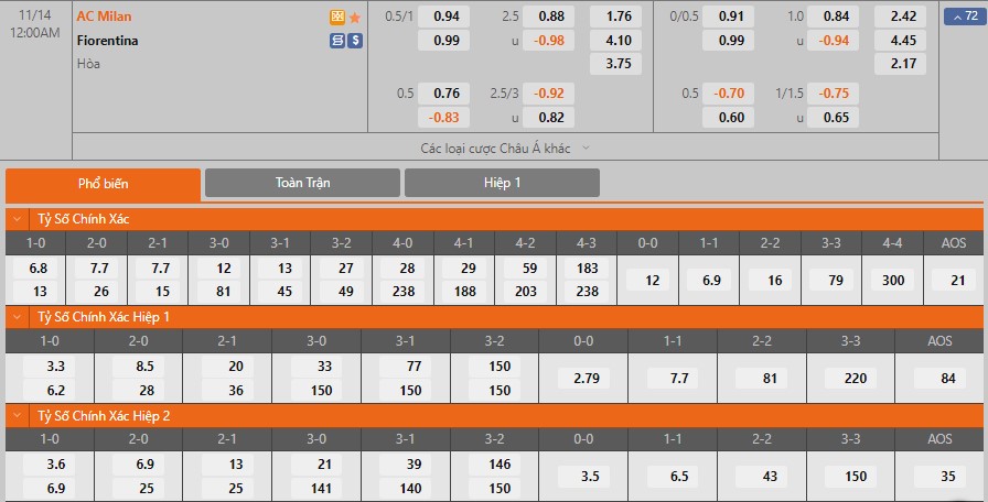 Soi kèo tài xỉu, kèo tỷ số AC Milan vs Fiorentina