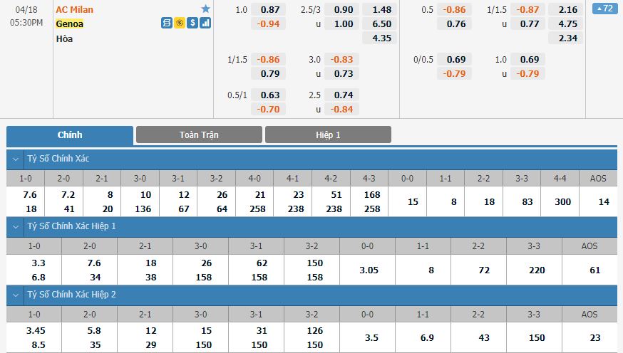 Soi kèo châu Á AC Milan vs Genoa
