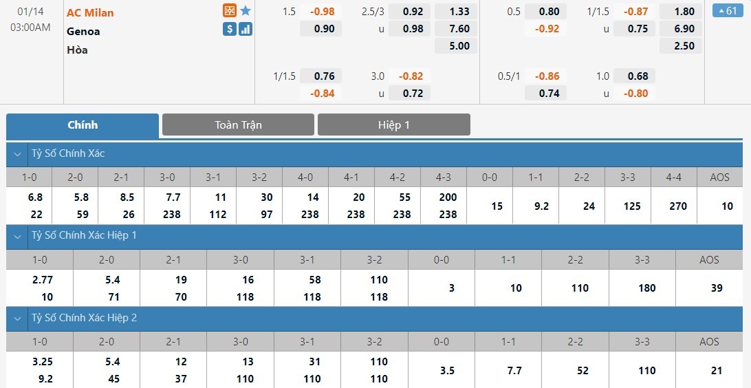Soi kèo tài xỉu, kèo tỷ số AC Milan vs Genoa