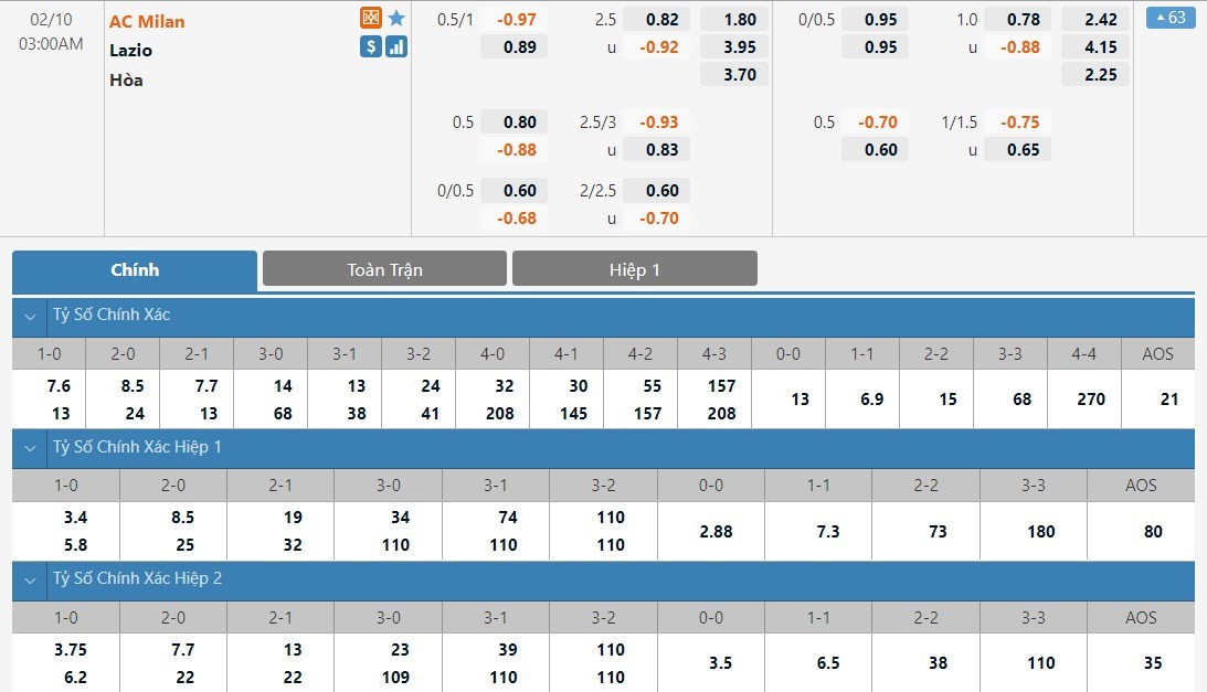 Hàng công của AC Milan đang thi đấu sa sút. Trong 3 trận gần đây, AC Milan chỉ ghi được 2 bàn (tính trong 90 phút thi đấu chính thức). Trước một Lazio khá khó chịu, AC Milan có thể sẽ lại có một trận đấu khá bế tắc. Với tỷ lệ tài xỉu ở mức 2 1/2 trái, ô cược xỉu sẽ là lựa chọn được đánh giá cao hơn cho kèo đấu này.