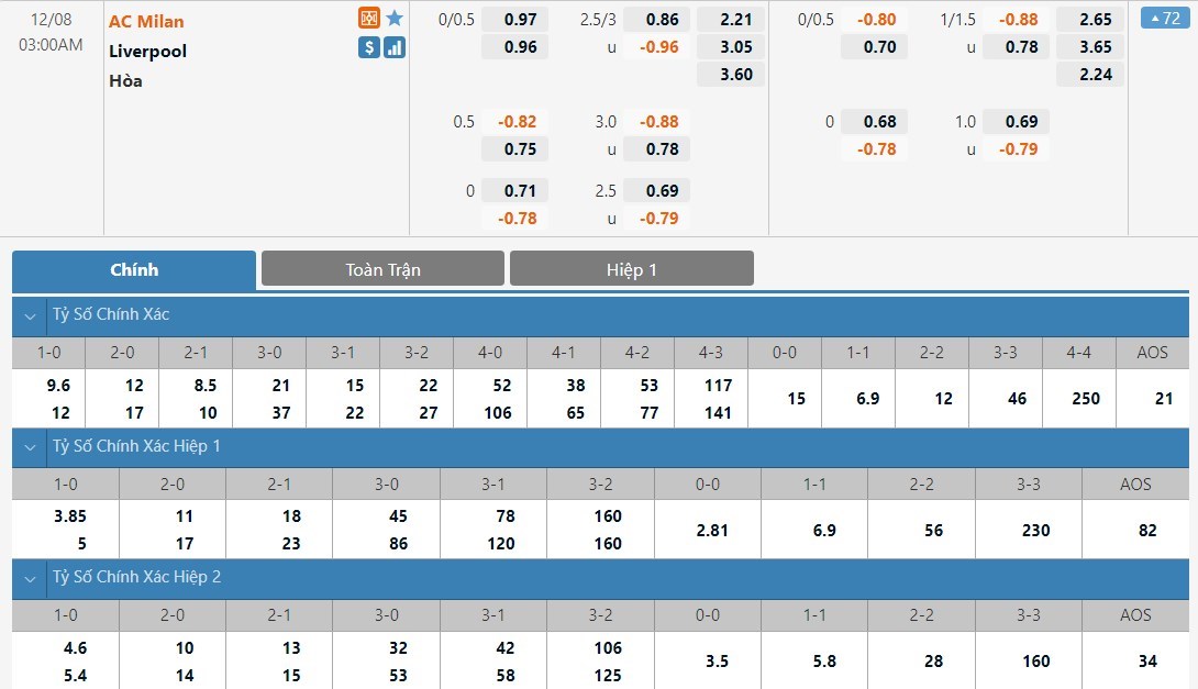 Soi kèo tài xỉu, kèo tỷ số AC Milan vs Liverpool
