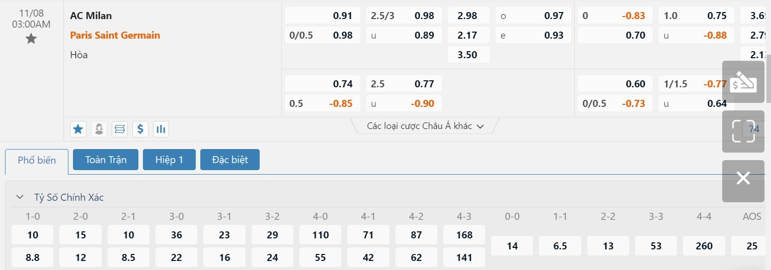 AC Milan dù chơi trên sân nhà nhưng sẽ không dễ để họ tìm kiếm bàn thắng sớm. Paris Saint Germain đang cho thấy hiệu suất làm bàn đáng nể. Họ ghi được từ 3 bàn thắng trở lên trong cả 4 trận gần nhất. Các nhà đầu tư nên tin tưởng vào khả năng nổ Tài ở cuộc đối đầu này với tỷ lệ tài xỉu là 2 3/4 trái.