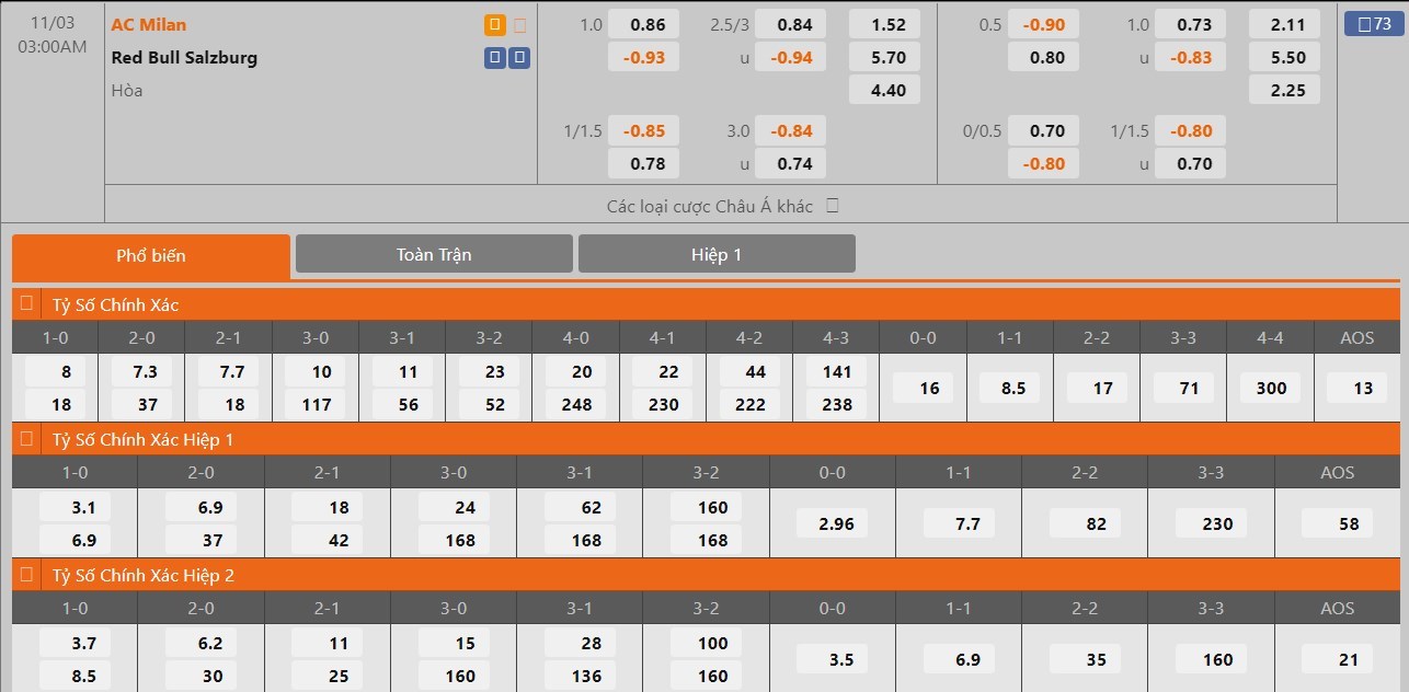 AC Milan được đánh giá cao hơn RB Salzburg khá nhiều ở trận này. Kết quả AC Milan thắng trận chỉ có tỷ lệ là 1 ăn 1.52 trong khi đó kết quả RB Salzburg thắng trận có tỷ lệ cược lên tới 1 ăn 5.70. Tỷ số hòa có tỷ lệ cược là 1 ăn 4.40. So với RB Salzburg, AC Milan đang không nhỉnh hơn quá nhiều. Phong độ của đội chủ nhà cũng đang là không quá ấn tượng và mạo hiểm với ô cược hòa ở kèo đấu này sẽ là một lựa chọn không tệ.