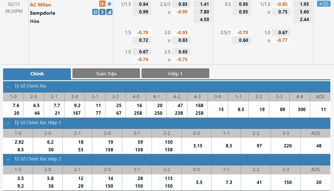 Soi kèo tài xỉu, kèo tỷ số AC Milan vs Sampdoria