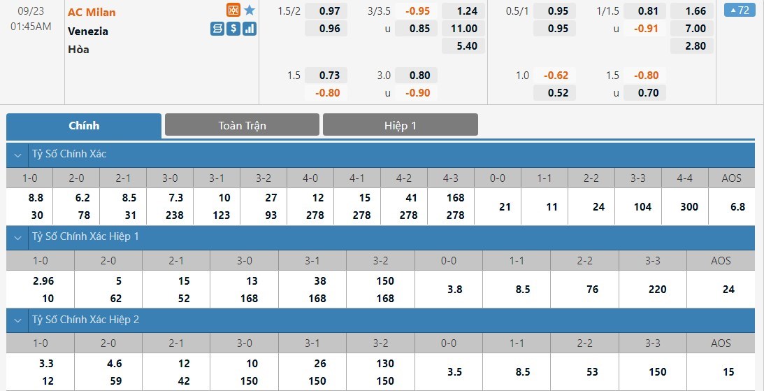 Kèo châu Á toàn trận: AC Milan -1 3/4 (FT)
