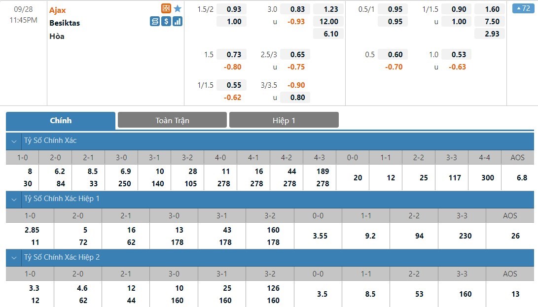 Dự đoán kèo tỷ số hiệp 1: Ajax Amsterdam 2-0 Besiktas