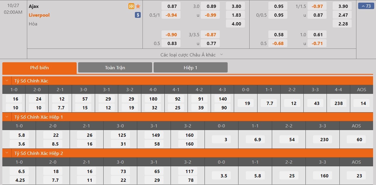 Phải làm khách nhưng Liverpool vẫn sẽ được đánh giá cao hơn Ajax rất nhiều ở kèo đấu này. Kết quả Ajax thắng trận có tỷ lệ cược là 1 ăn 3.80 trong khi đó kết quả Liverpool thắng trận có tỷ lệ cược là 1 ăn 1.83. Tỷ số hòa có tỷ lệ cược là 1 ăn 4.00. Liverpool lúc này đang khủng hoảng lực lượng. Họ đang gặp khá nhiều khó khăn và làm khách trước một đối thủ không yếu, họ có thể sẽ chấp nhận có được 1 điểm.