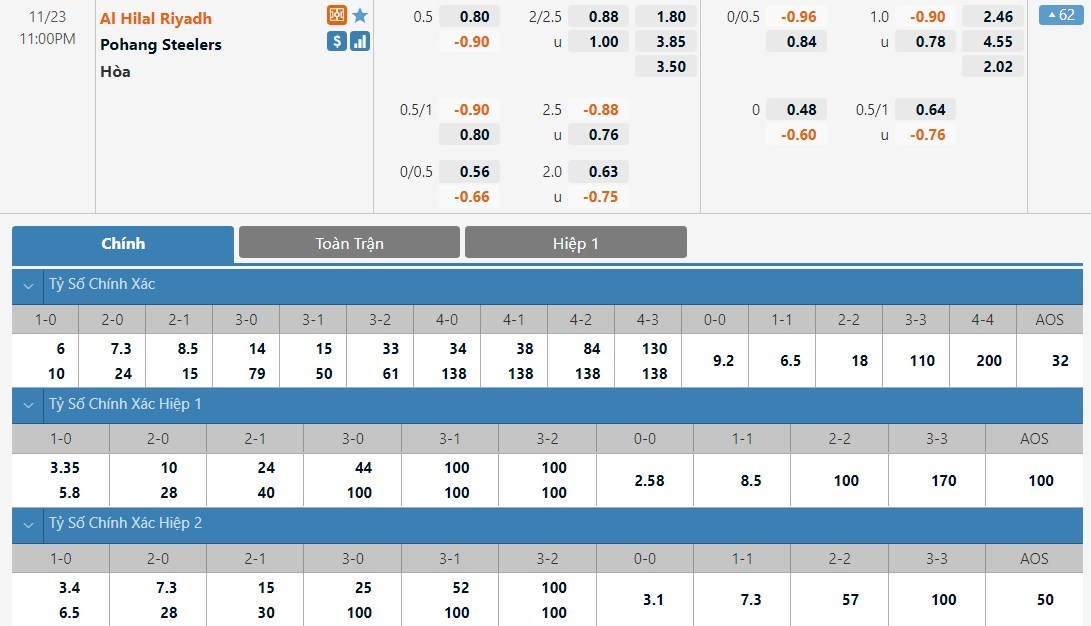 Al Hilal sẽ là cửa trên ở trận này với tỷ lệ cược 1 ăn 1.80. Pohang Steelers có tỷ lệ cược là 1 ăn 3.85 trong khi đó tỷ số hòa có tỷ lệ cược là 1 ăn 3.50. Pohang Steelers lúc này đang có phong độ không tốt. Trước một Al Hilal rất già dơ và còn phải làm khách, Pohang Steelers sẽ khó để tạo ra được bất ngờ.