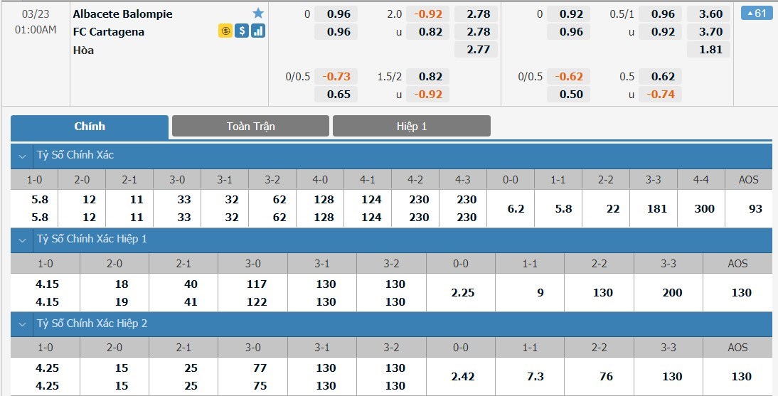 Albacete và Cartagena đều có tỷ lệ cược ở mức 1 ăn 2.78 ở trận này. Tỷ số hòa cũng có tỷ lệ cược gần như tương tự với 1 ăn 2.77. Xét về phong độ của 2 đội ở thời điểm hiện tại, Cartagena đang cho thấy nhiều dấu hiệu tích cực hơn so với Albacete. Ở trận lượt đi của 2 đội, Cartagena cũng từng đánh bại Albacete với tỷ số 3-1. Ở kèo đấu này, Cartagena sẽ là lựa chọn mang lại cảm giác tin cậy lớn hơn.