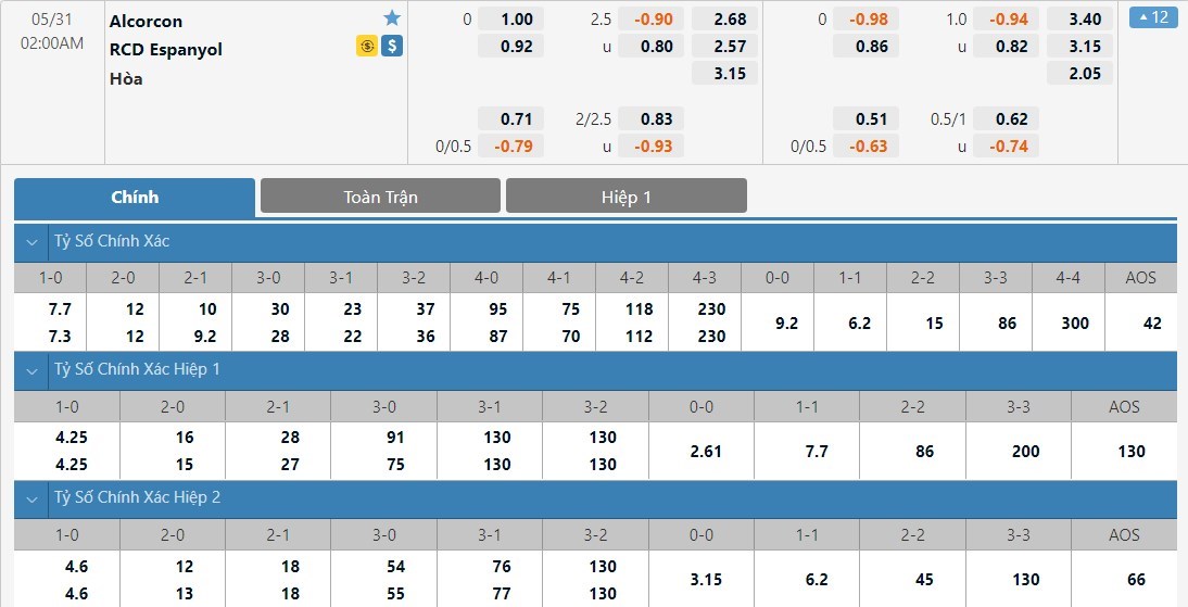 Tỷ lệ cược của Alcorcon và Espanyol ở trận này gần như cân bằng nhau. Alcorcon có tỷ lệ cược là 1 ăn 2.68 trong khi đó Espanyol có tỷ lệ cược là 1 ăn 2.57. Tỷ số hòa có tỷ lệ cược là 1 ăn 3.15. Alcorcon đang rất khát điểm để cạnh tranh vé trụ hạng và chắc chắn họ sẽ thi đấu rất quyết tâm. Trước một Espanyol đã hết động lực, Alcorcon hoàn toàn có thể sẽ có được 1 điểm ở trận này.