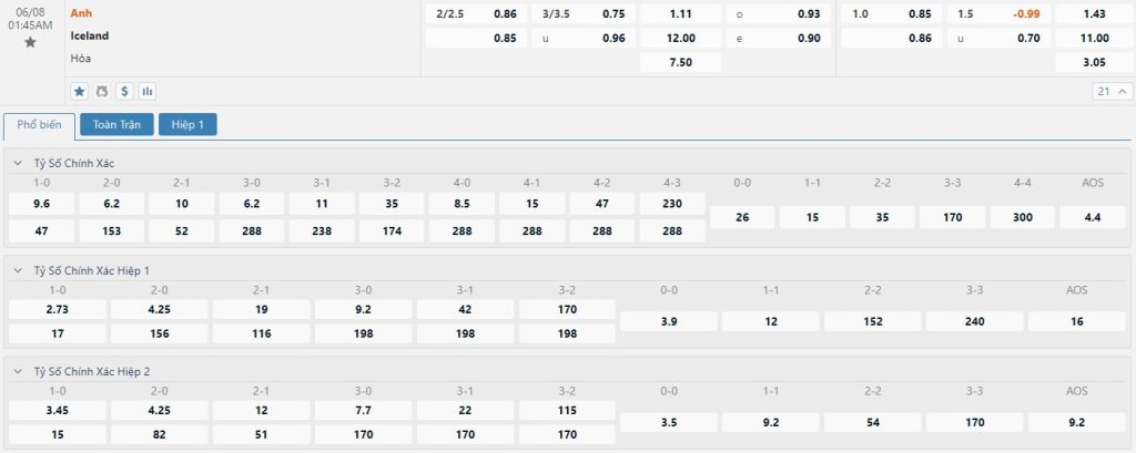 Soi kèo tài xỉu, kèo tỷ số Anh vs Iceland