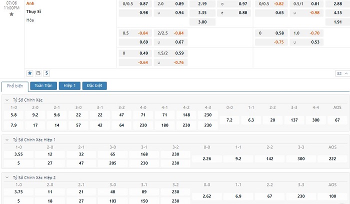 Kèo châu Á toàn trận: Anh vs Thụy Sĩ+1 1/4 (FT)