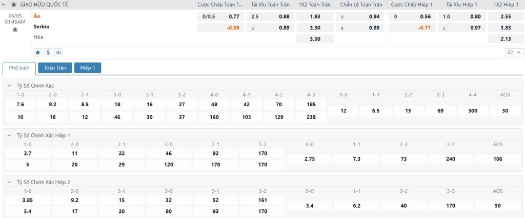 Soi kèo tài xỉu, kèo tỷ số Áo vs Serbia