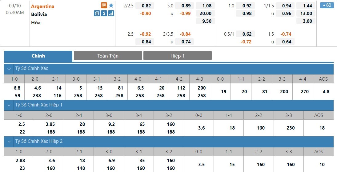 Soi kèo tài xỉu, kèo tỷ số Argentina vs Bolivia