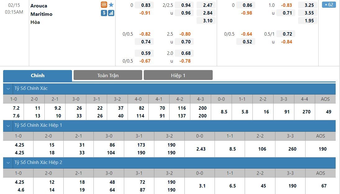 Arouca và Maritimo có tỷ lệ cược rất cân bằng ở trận này. Arouca có tỷ lệ cược là 1 ăn 2.47 trong khi đó Maritimo có tỷ lệ cược là 1 ăn 2.84. Tỷ số hòa có tỷ lệ cược là 1 ăn 3.10. Arouca lúc này vẫn đang tỏ ra kém hiệu quả. Chỉ phải làm khách trước một đối thủ khá dễ chịu, Maritimo sẽ kiếm được 1 điểm ở trận này.