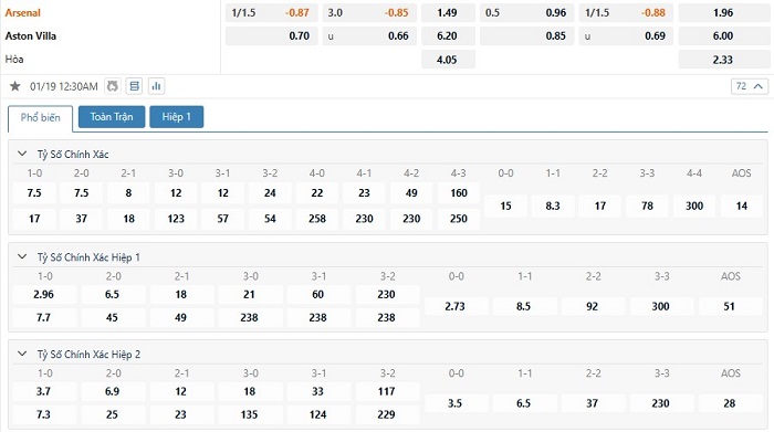 Soi kèo tài xỉu, kèo tỷ số Arsenal vs Aston Villa