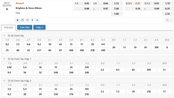 Soi kèo tài xỉu, kèo tỷ số Arsenal vs Brighton