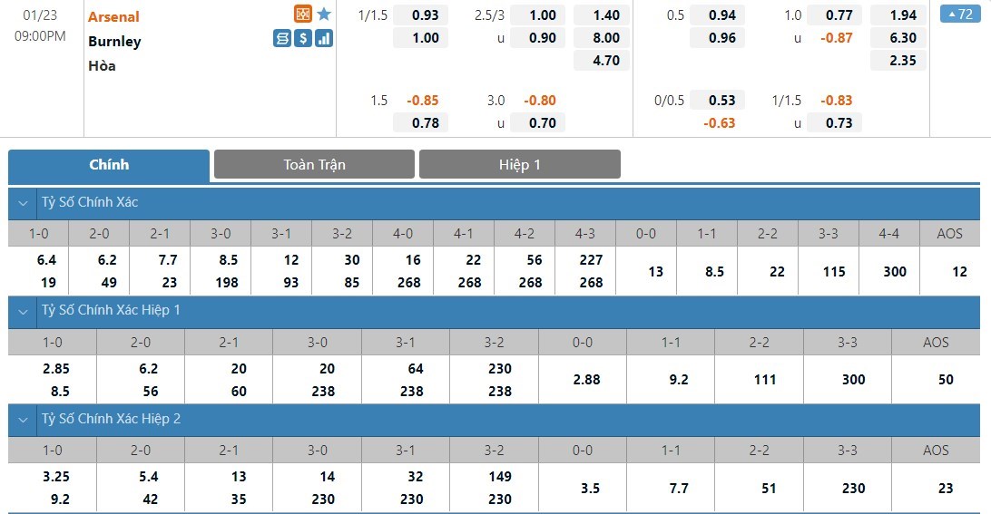Soi kèo tài xỉu, kèo tỷ số Arsenal vs Burnley