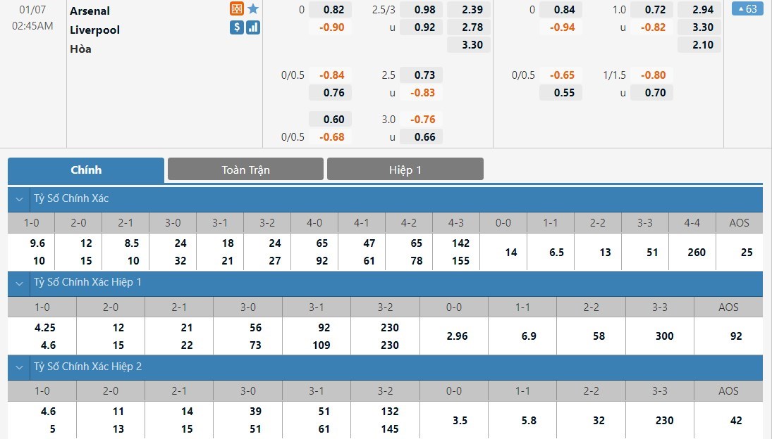 Dự đoán kèo tỷ số hiệp 1: Arsenal 2-0 Liverpool