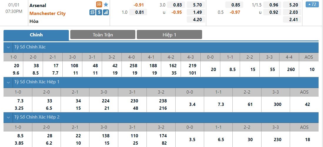 Man City vẫn sẽ được đánh giá cao hơn Arsenal rất nhiều ở kèo đấu này. Tỷ lệ cược của Man City chỉ là 1 ăn 1.49 trong khi đó Arsenal có tỷ lệ cược lên tới 1 ăn 5.70. Tỷ số hòa có tỷ lệ cược là 1 ăn 4.20. Man City đang có phong độ rất cao và đây vẫn đang là một đối thủ quá tầm cho Arsenal. Cửa trên Man City vẫn sẽ là lựa chọn cho kèo đấu này.