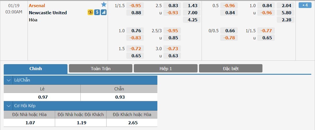 Tỷ lệ cược của 2 đội bóng ở kèo đấu này có sự chênh lệch khá lớn. Arsenal chỉ có tỷ lệ cược là 1 ăn 1.43 trong khi Newcastle có tỷ lệ cược lên tới 1 ăn 7.00. Tỷ số hòa có tỷ lệ cược là 1 ăn 4.25. Phong độ của Arsenal đang có dấu hiệu khởi sắc hơn. Chỉ phải đón tiếp một Newcastle không được đánh giá cao, Arsenal được dự đoán sẽ có chiến thắng ở trận này.