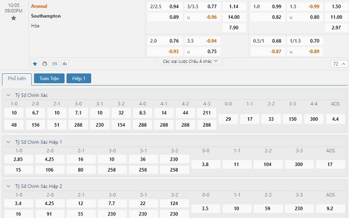 Soi kèo tài xỉu, kèo tỷ số Arsenal vs Southampton