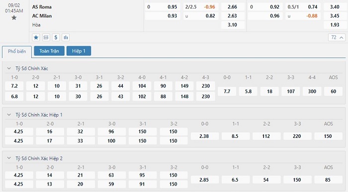 Soi kèo tài xỉu, kèo tỷ số AS Roma vs AC Milan