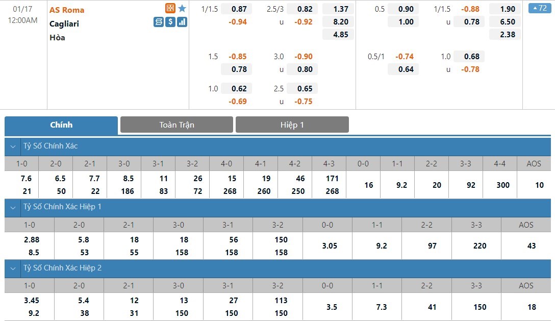 AS Roma vẫn sẽ được đánh giá cao hơn Cagliari rất nhiều ở kèo đấu này. Tỷ lệ cược của AS Roma là 1 ăn 1.37 trong khi đó Cagliari có tỷ lệ cược lên tới 1 ăn 8.20. Tỷ số hòa có tỷ lệ cược là 1 ăn 4.85. Cagliari vẫn đang bị đánh giá rất thấp. Với lợi thế sân nhà cùng trình độ cao hơn đối thủ không ít, AS Roma vẫn sẽ đủ khả năng giành trọn 3 điểm.