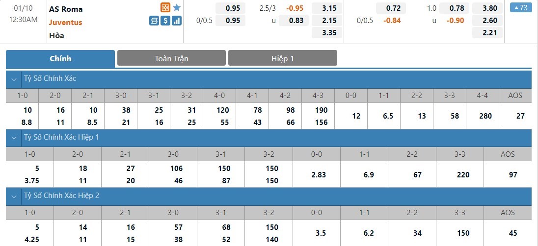 Soi kèo tài xỉu, kèo tỷ số AS Roma vs Juventus