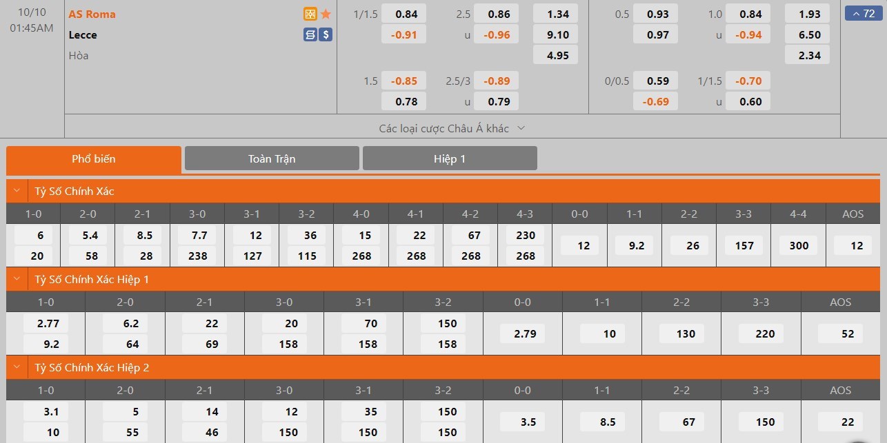 Kèo châu Âu hiệp 1: AS Roma