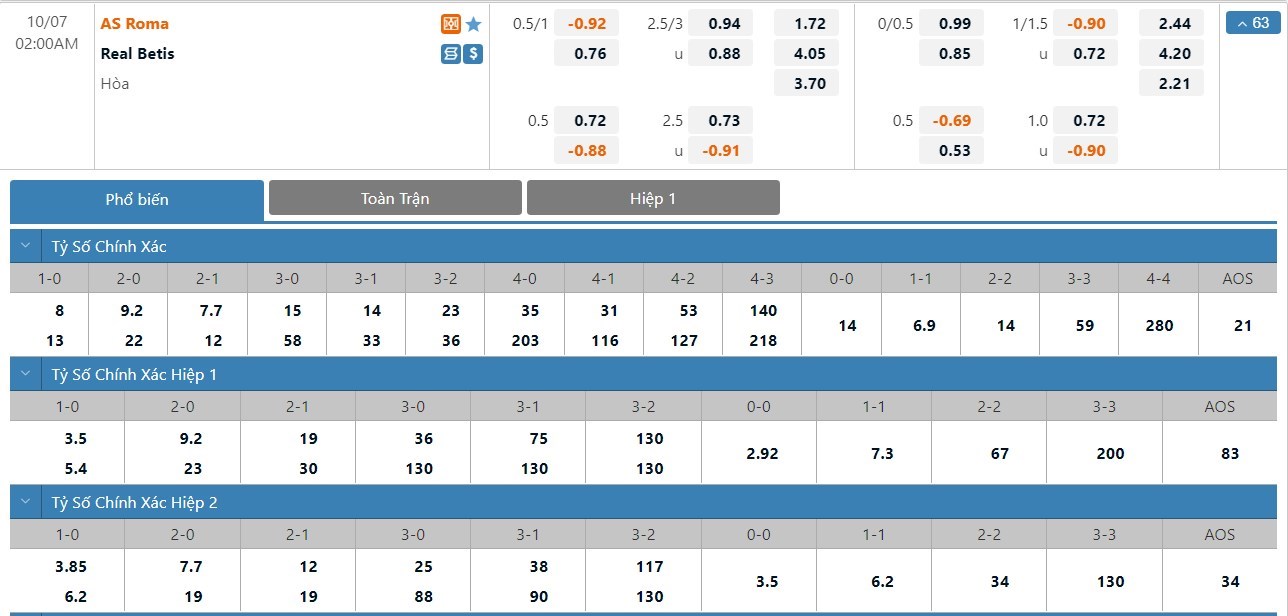 Soi kèo tài xỉu, kèo tỷ số AS Roma vs Real Betis