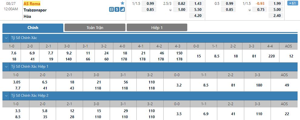 Dự đoán kèo tỷ số hiệp 1: AS Roma 2-1 Trabzonspor