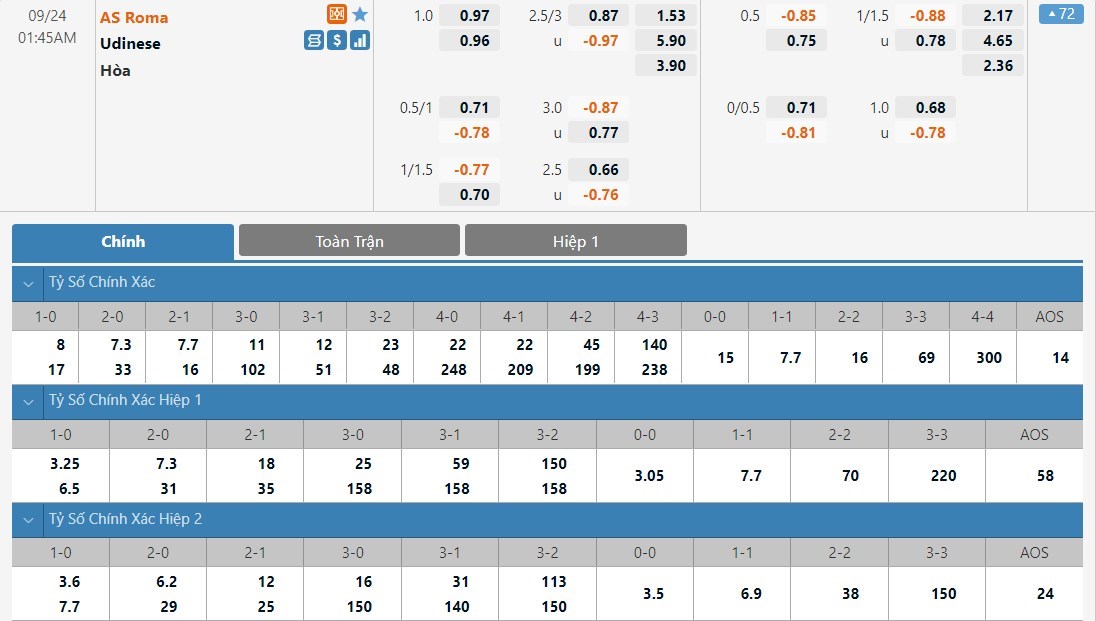 Dự đoán kèo tỷ số hiệp 1: AS Roma 1-1 Udinese