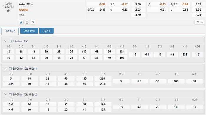 Soi kèo tài xỉu, kèo tỷ số Aston Villa vs Arsenal