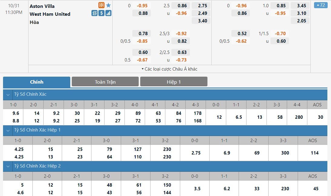 Tỷ lệ cược của Aston Villa và West Ham ở kèo đấu này khá cân bằng. Aston Villa có tỷ lệ cược là 1 ăn 2.75 trong khi đó West Ham có tỷ lệ cược là 1 ăn 2.49. Tỷ số hòa có tỷ lệ cược là 1 ăn 3.40. West Ham vẫn đang thi đấu rất tốt ở mùa giải năm nay trong khi đó Aston Villa vẫn đang liên tiếp gây thất vọng. Ở trận này, West Ham được dự đoán sẽ có một chiến thắng.