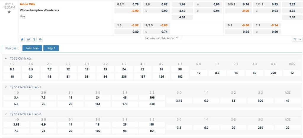 Mốc tỷ lệ chấp -3/4 trái được nhà cái đưa ra đủ cho thấy đội ngũ chuyên môn đánh giá cao cửa thắng của Aston Villa trong trận này. Ở 3 trận đấu gần nhất chơi trên sân nhà của mình, Aston Villa thắng 2 và chỉ thua 1 trận. Đó là trận thua 0-4 dưới tay Tottenham. Ở cuộc đối đầu giữa Aston Villa và Wolves tại giai đoạn lượt đi mùa bóng năm nay, Aston Villa và Wolves đã cầm chân nhau với tỷ số hòa 1-1. Song ở cuộc đối đầu sắp tới thì nhiều khả năng phần thắng sẽ thuộc về Aston Villa.