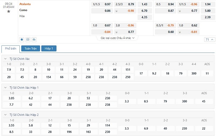 Dự đoán kèo tỷ số hiệp 1: Atalanta 1-0 Como