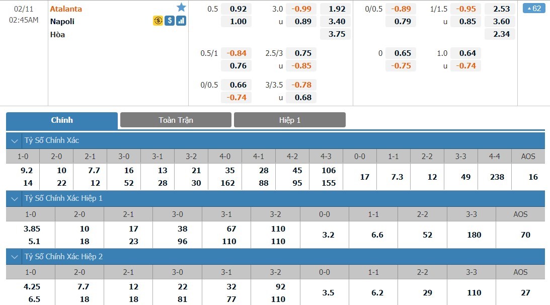 Soi kèo tài xỉu, kèo tỷ số Atalanta vs Napoli