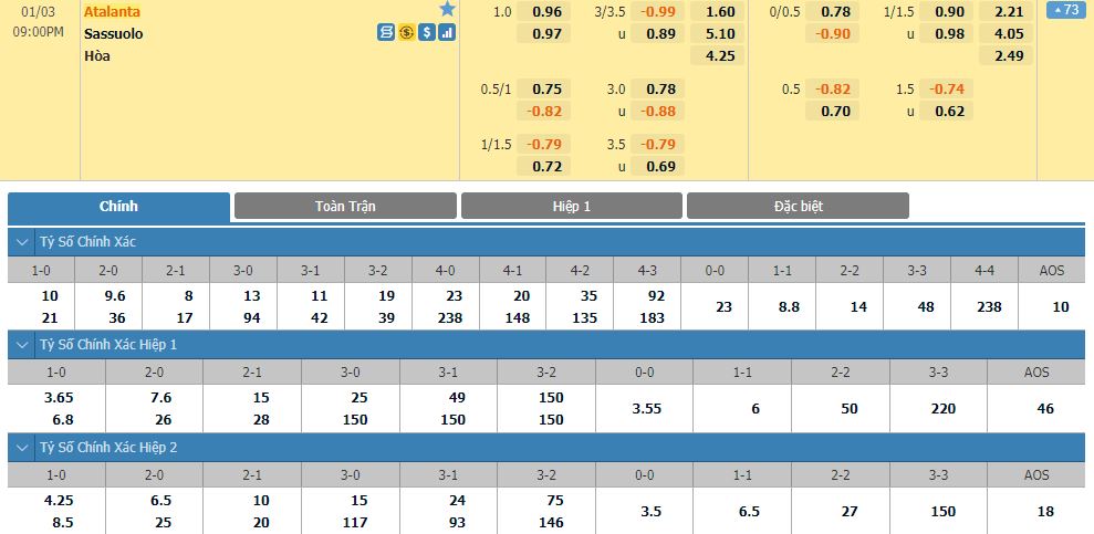 Dự đoán kèo tỷ số hiệp 1: Atalanta 1-1 Sassuolo