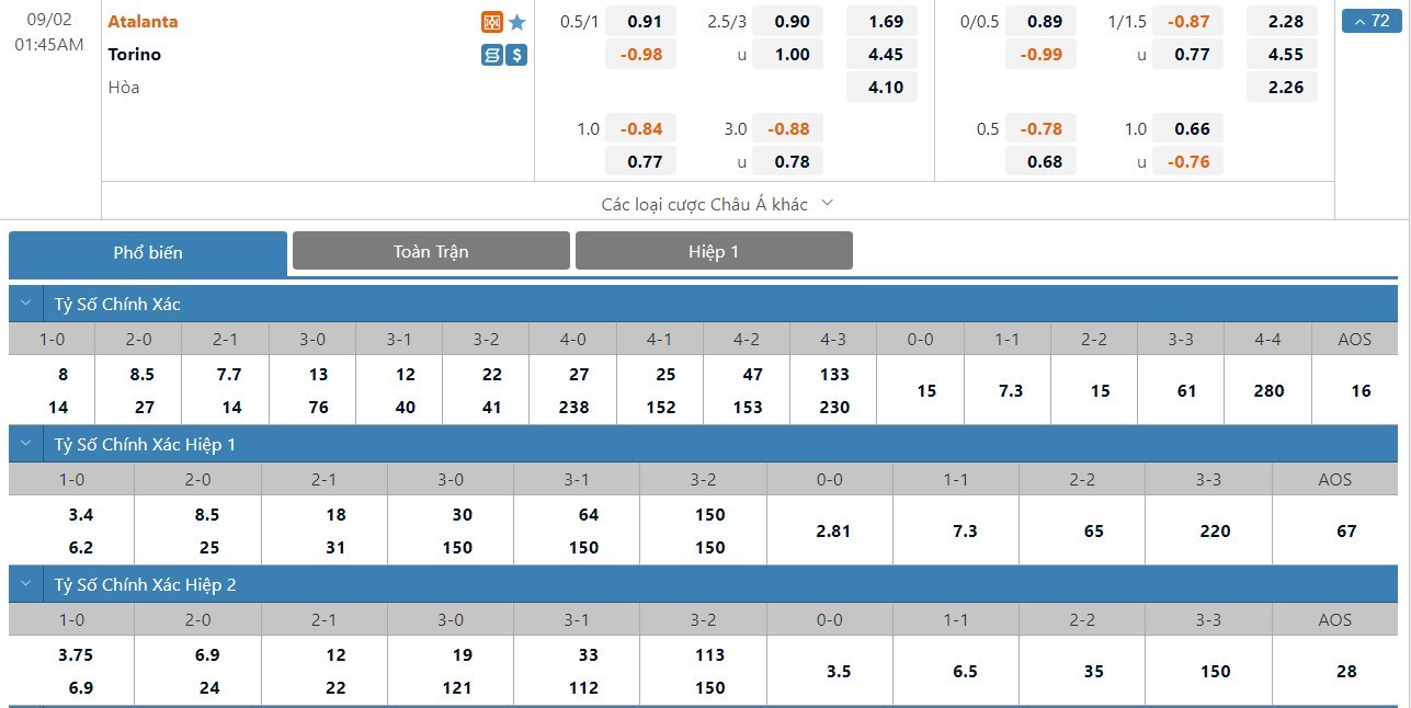 Atalanta sẽ được đánh giá cao hơn Torino rất nhiều ở kèo đấu này. Kết quả Atalanta thắng trận chỉ có tỷ lệ cược là 1 ăn 1.69 trong khi đó kết quả Torino thắng trận có tỷ lệ cược lên tới 1 ăn 4.45. Tỷ số hòa có tỷ lệ cược là 1 ăn 4.10. Atalanta đang có phong độ cao. Làm khách trước một đối thủ trên cơ, Torino sẽ khó tạo ra được quá nhiều bất ngờ. Atalanta đang tỏ ra nhỉnh hơn và đội chủ nhà sẽ có được 3 điểm ở trận này.