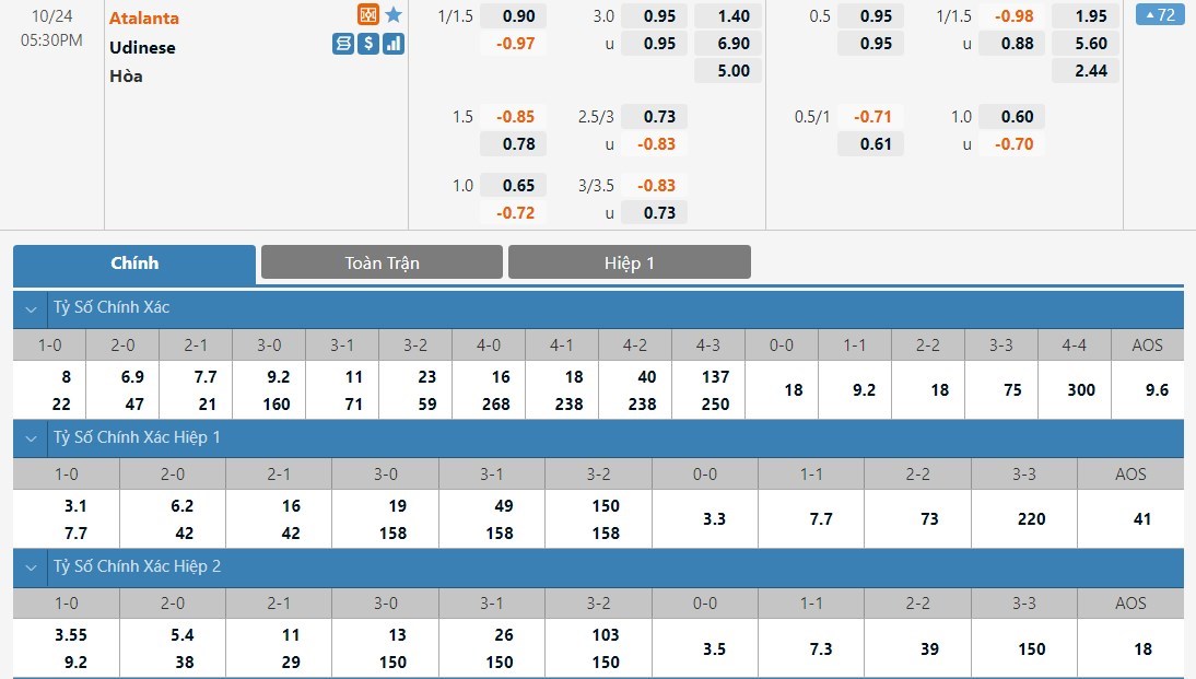 Dự đoán kèo tỷ số hiệp 1: Atalanta 1-1 Udinese
