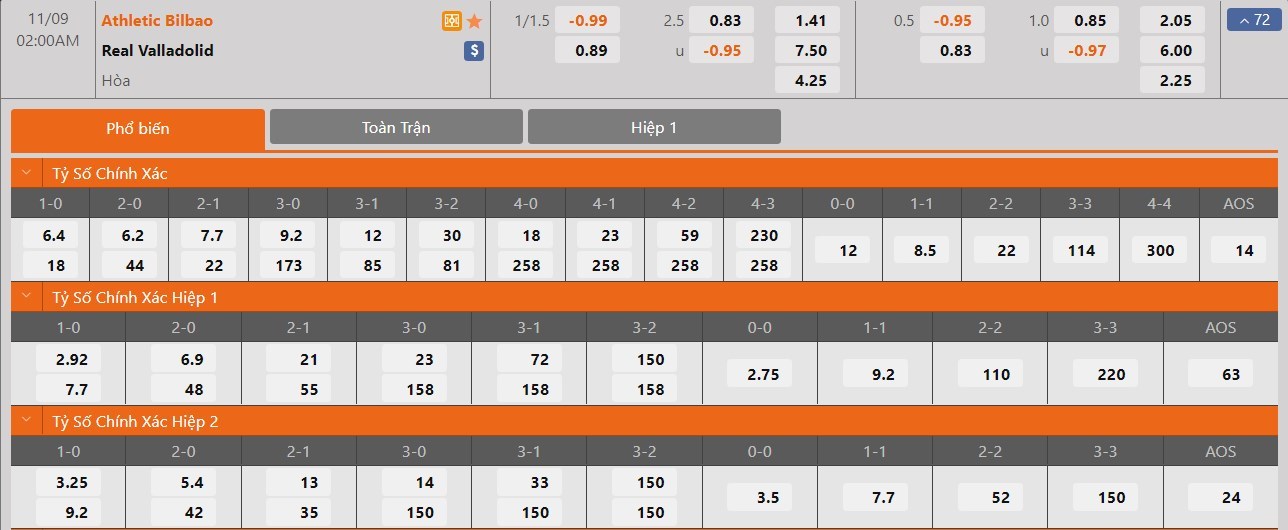 Dự đoán kèo tỷ số hiệp 1: Athletic Bilbao 2-0 Real Valladolid