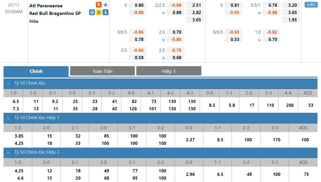 Athletico Paranaense và Bragantino có tỷ lệ cược gần như cân bằng ở trận này. Athletico Paranaense sẽ có tỷ lệ 1 ăn 2.51 trong khi Bragantino có tỷ lệ cược cao hơn đôi chút với 1 ăn 2.82. Tỷ số hòa có tỷ lệ cược là 1 ăn 3.05. Thực lực 2 đội đang được đánh giá ở mức rất cân bằng và khả năng hai đội cầm hòa nhau ở trận này là khá cao.