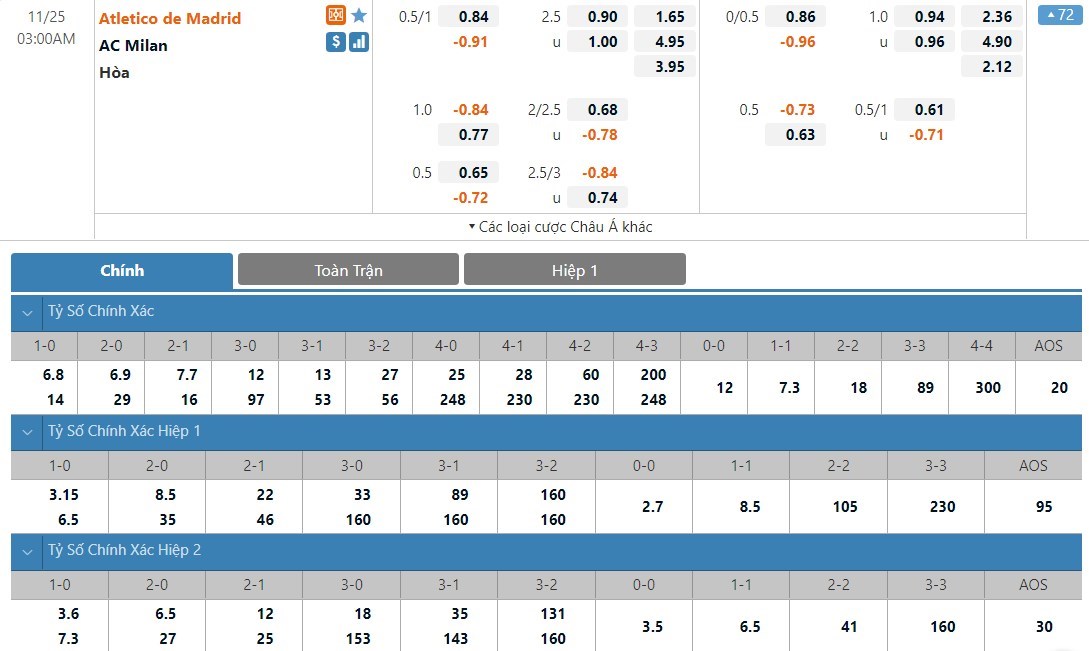 Soi kèo châu Á Atletico Madrid vs AC Milan